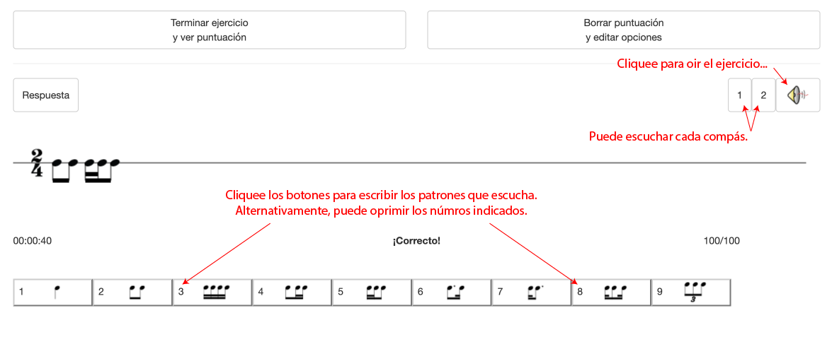 En este ejercicio, se escucharán patrones rítmicos que se transcribirán en un pentagrama seleccionando los patrones escuchados.