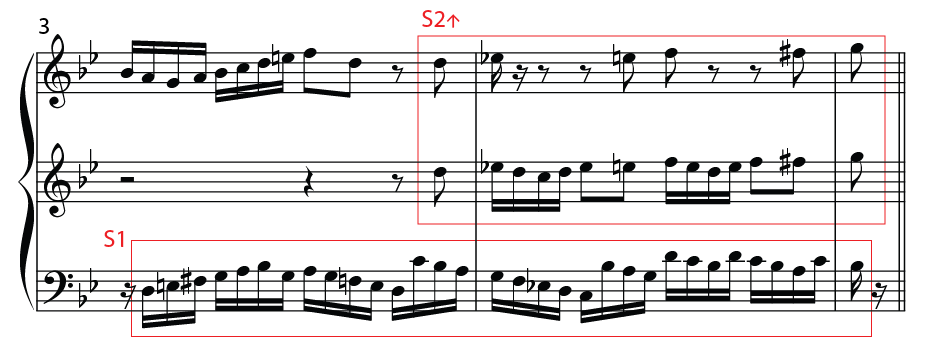 The voices exchange the subjets in measure 3. S1 uses an F natural in the third beat (in red) instead of a sharp. S2 ascending form (S2↑) now enters in the fourth beat and not in the second beat: