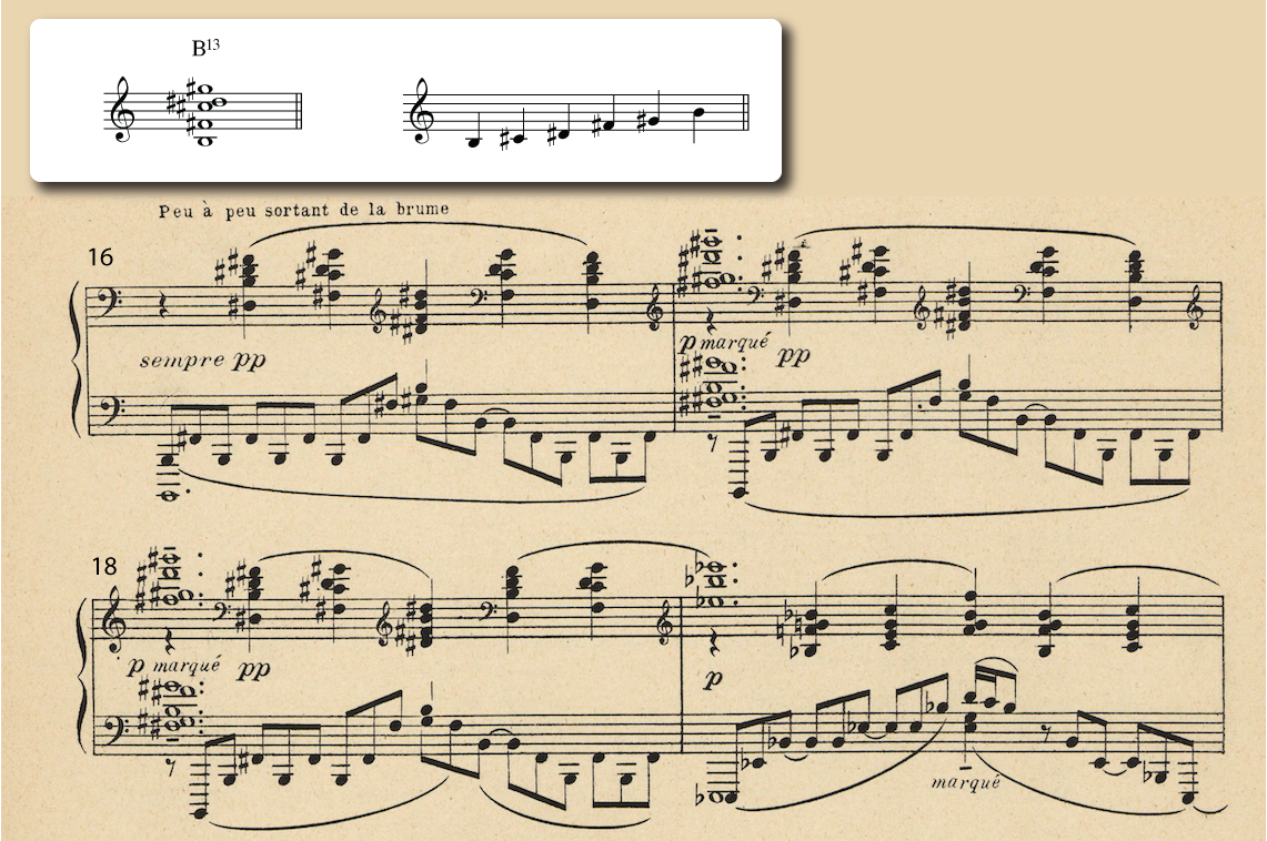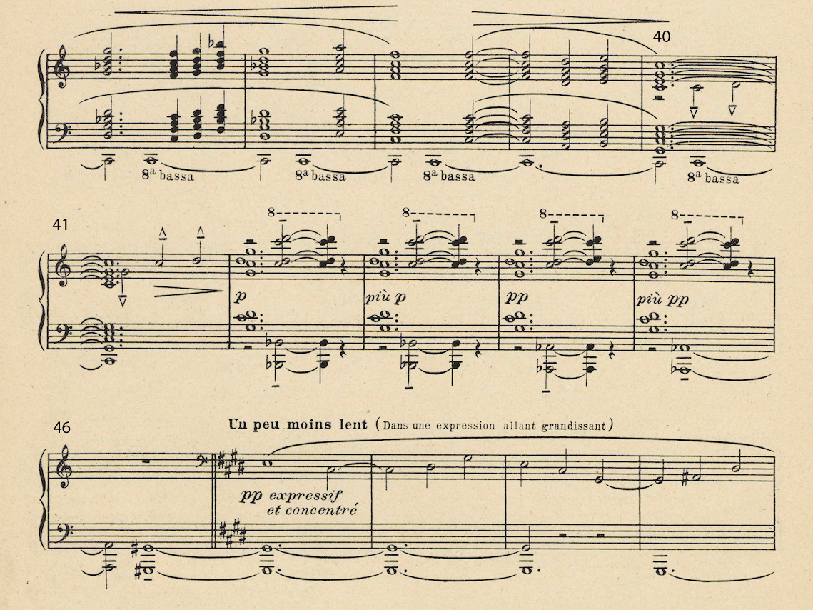"This piece is based on an ancient Breton myth in which a cathedral, submerged underwater off the coast of the Island of Ys, rises up from the sea on clear mornings when the water is transparent. Sounds can be heard of priests chanting, bells chiming, and the organ playing, from across the sea."