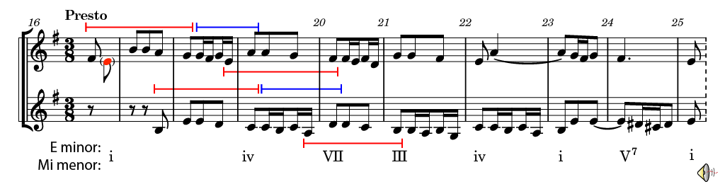 By simplifying the melodic lines, the sixteenth note motive of the lower voice is similar to the eighth note motive of the upper voice. Notice the fourth interval. In the upper voice, from the first eighth note to the second; in the lower voice, from the third to the first.