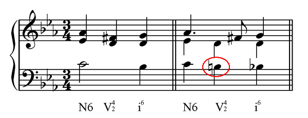 Podemos también interpretar el acorde del 2do tiempo del compás 5 como una sexta napolitana de sol menor (do - mib - lab) que resuelve a un acorde de dominante de do (do - re - fa#). El si natural sería una nota de paso cromática:
