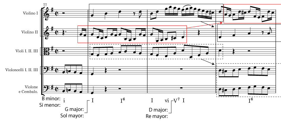 A partir del compás 70, reaparecen los motivos rojo, azul y verde en las violas, chelos y continuo.