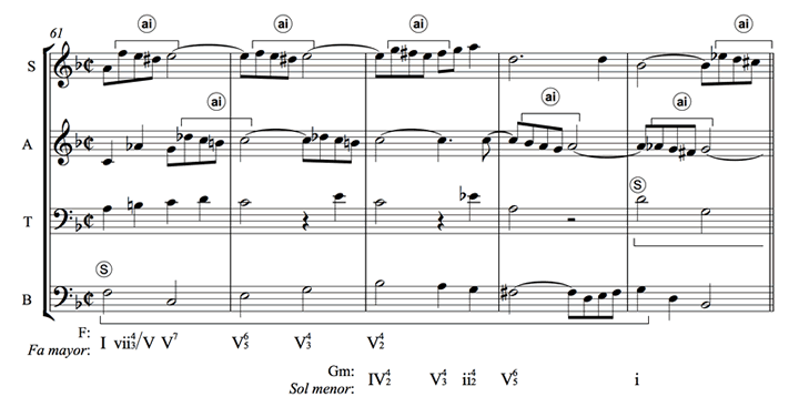 Al llegar al compás 61 la tonalidad de fa mayor está establecida. El sujeto del bajo (luego del primer fa) es un arpegio del acorde de dominante de fa (do - mi - sol - sib). El uso del motivo ai por la soprano y el alto introduce disonancias y contribuye a la complejidad armónica del pasaje. En la soprano el motivo fa - mi - re# - mi refuerza la tercera del acorde de dominante, pero el fa y el re# ayudan al carácter disonante del pasaje. Igualmente con el motivo en el alto. El re bemol es la novena menor del acorde de dominante de fa menor, pero el si natural choca con el si bemol propio del acorde de dominante. El acorde de do dominante es usado como IV grado de sol menor y encadenado con la dominante de esa tonalidad para finalizar en sol menor. Note que luego de llegar a sol menor las voces superiores insisten el uso del motivo ai. Sobre todo el la bemol del alto es altamente disonante e inusual: